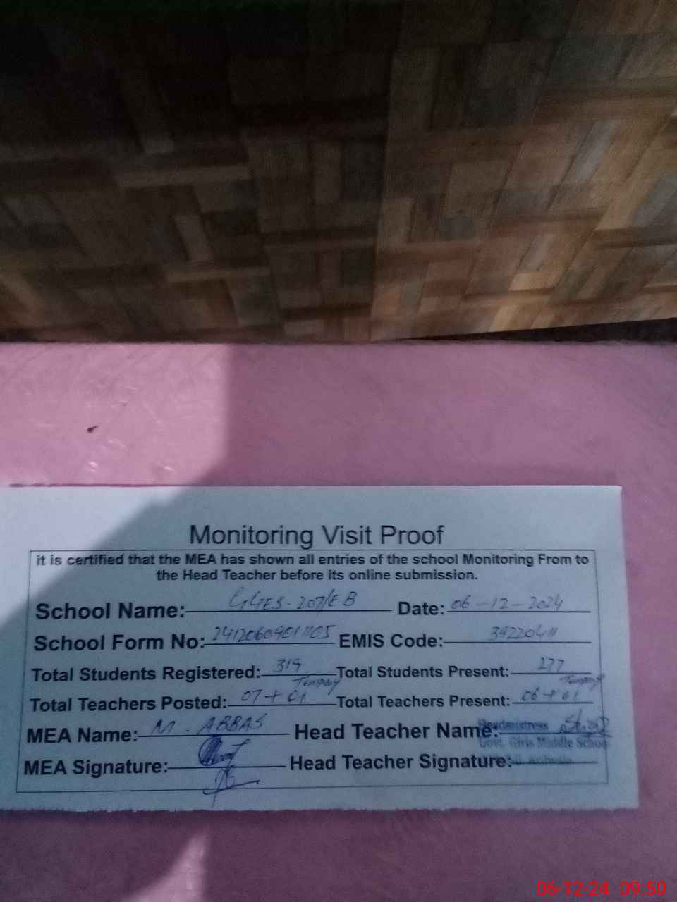 | Attendance Register | Head Teacher | MEA with School | Visit Proof |