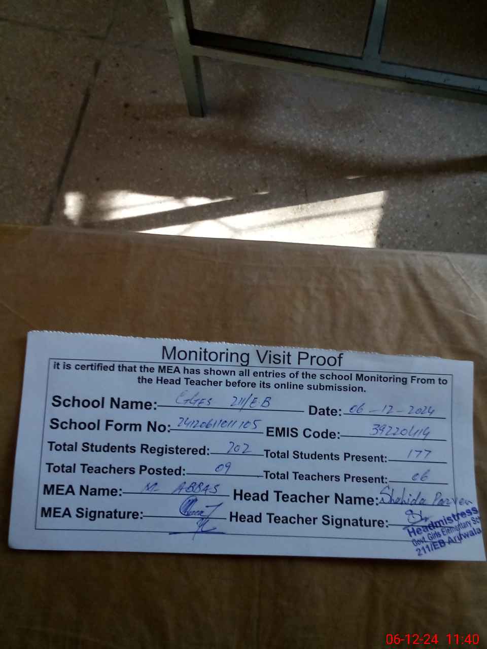 | Certified that this School was Inspected by the Undersigned MEA/DMO Today and the Information Stated Above is as Per Record. | |||||