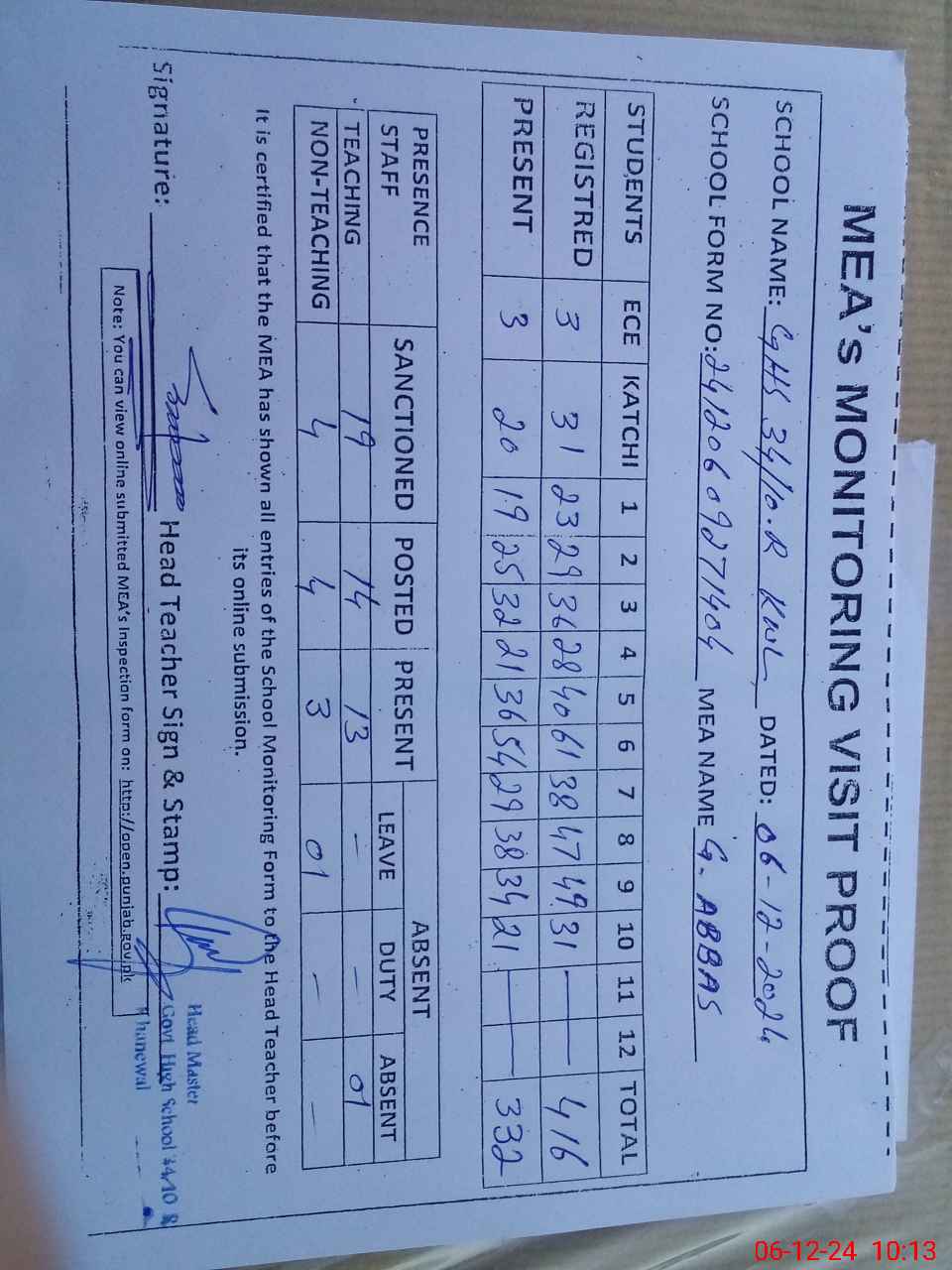 | Attendance Register | Head Teacher | MEA with School | Visit Proof |