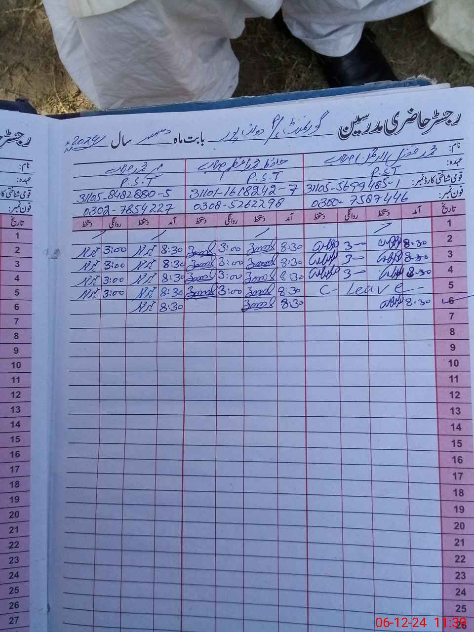 | CNIC | Full Name | Designation | R/C | Absence during last cal. month |