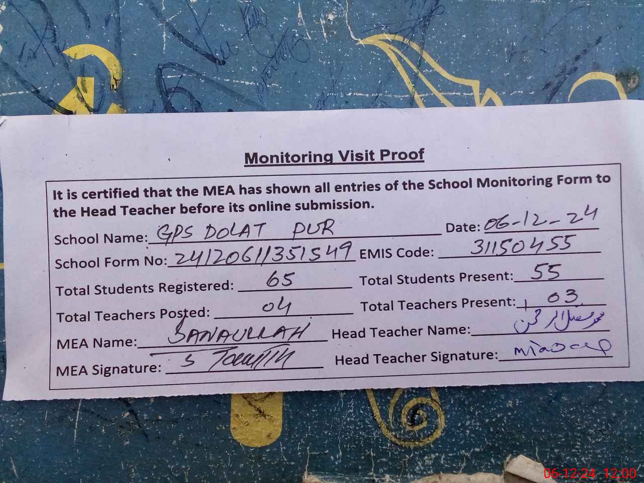 | Attendance Register | Head Teacher | MEA with School | Visit Proof |