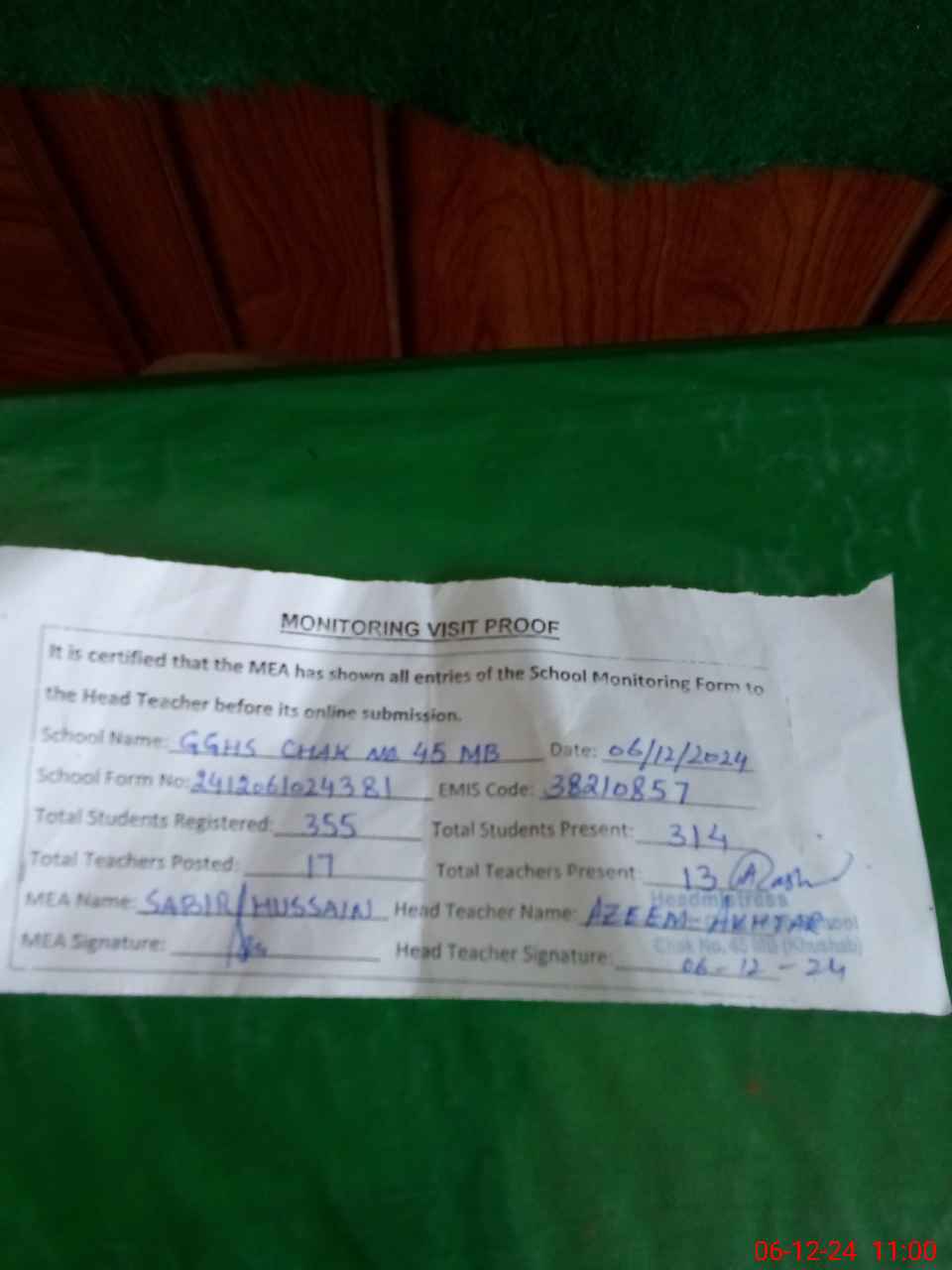 | Attendance Register | Head Teacher | MEA with School | Visit Proof |