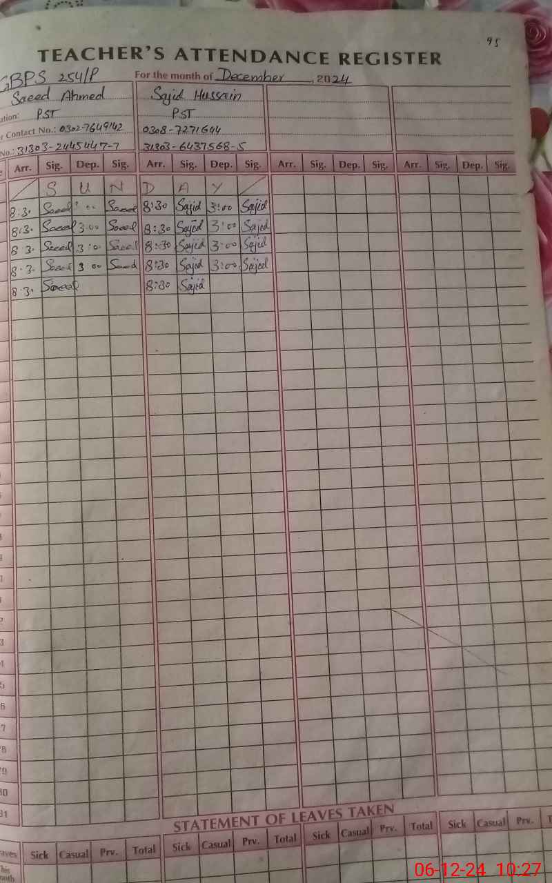 | CNIC | Full Name | Designation | R/C | Absence During Last Calender Month |