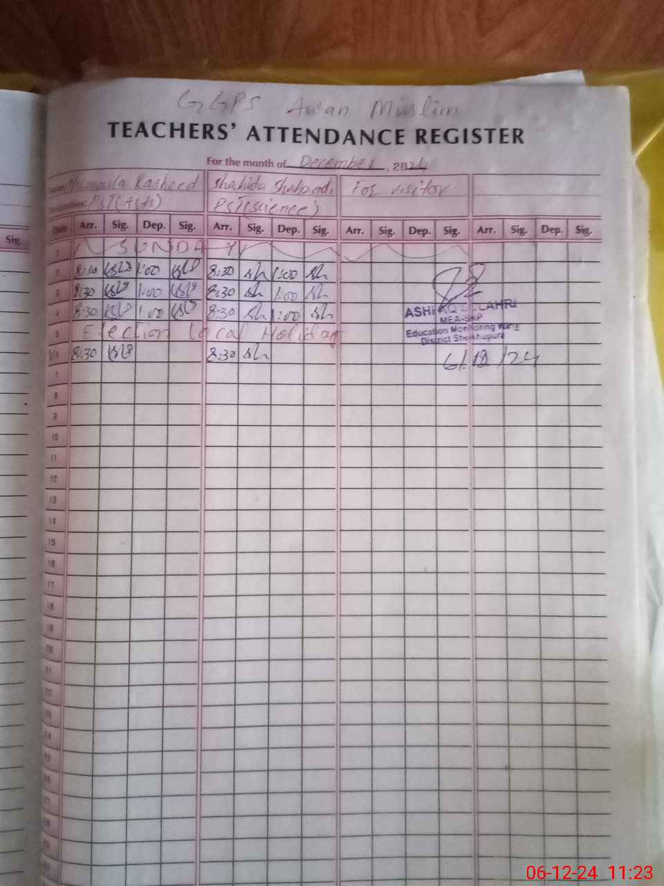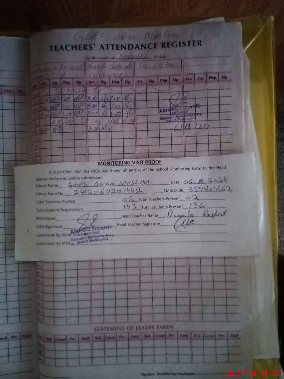 | Attendance Register | Head Teacher | MEA with School | Visit Proof |