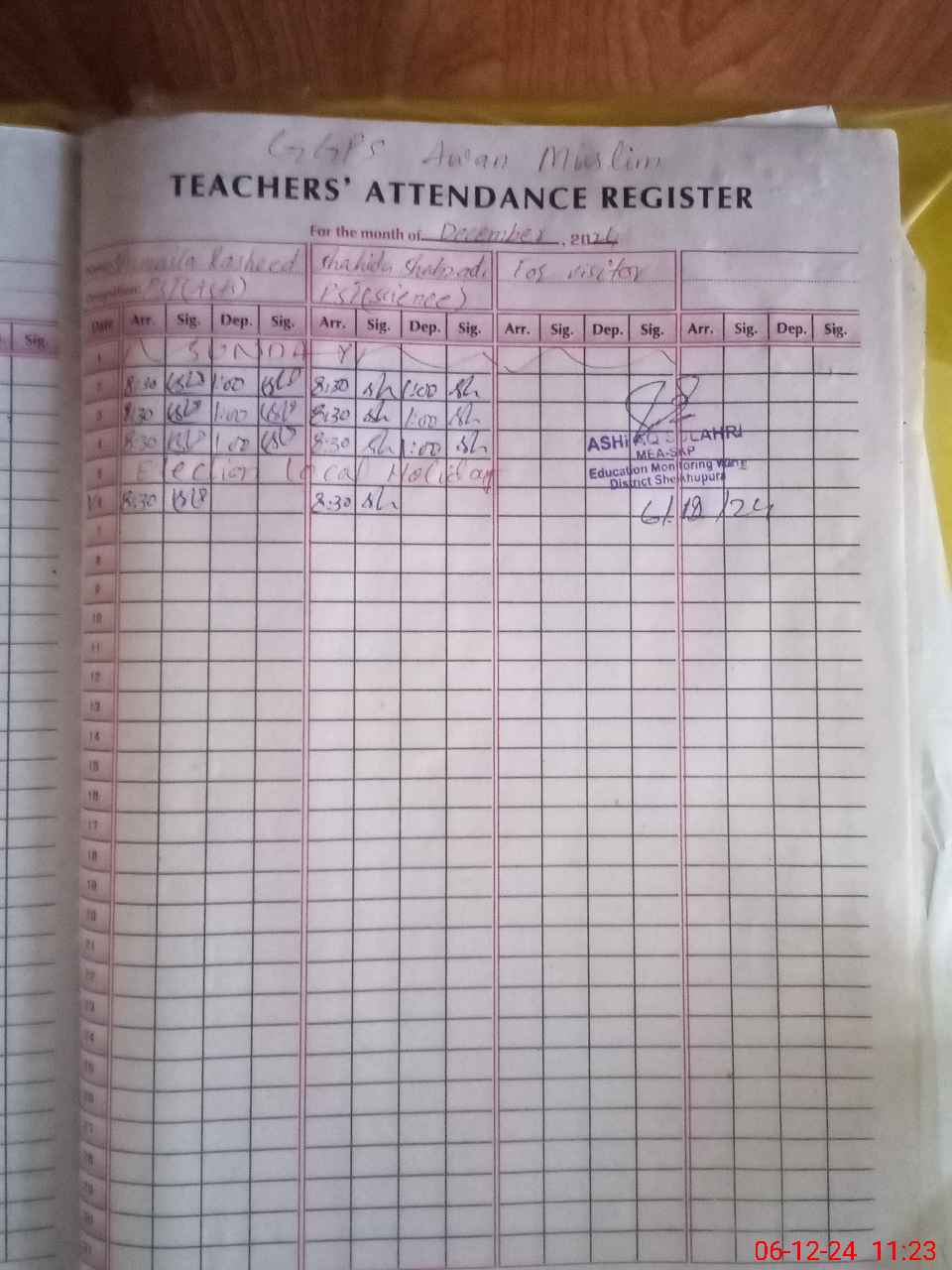 | Name: SH**** RA**** Designation: (School Headmaster's/Headmistress's) PST Phone/Cell Number: 03**** |