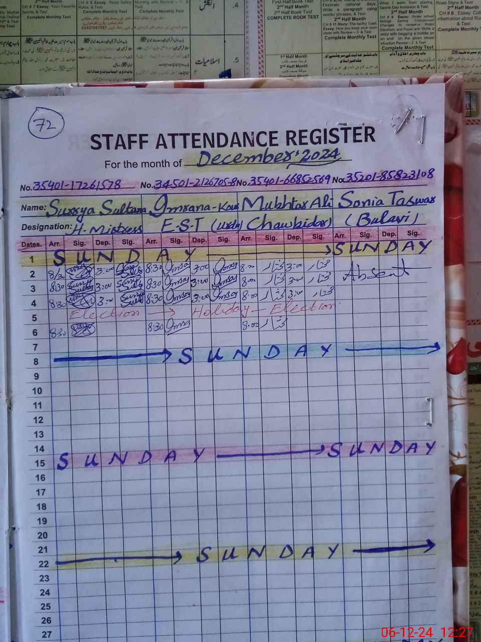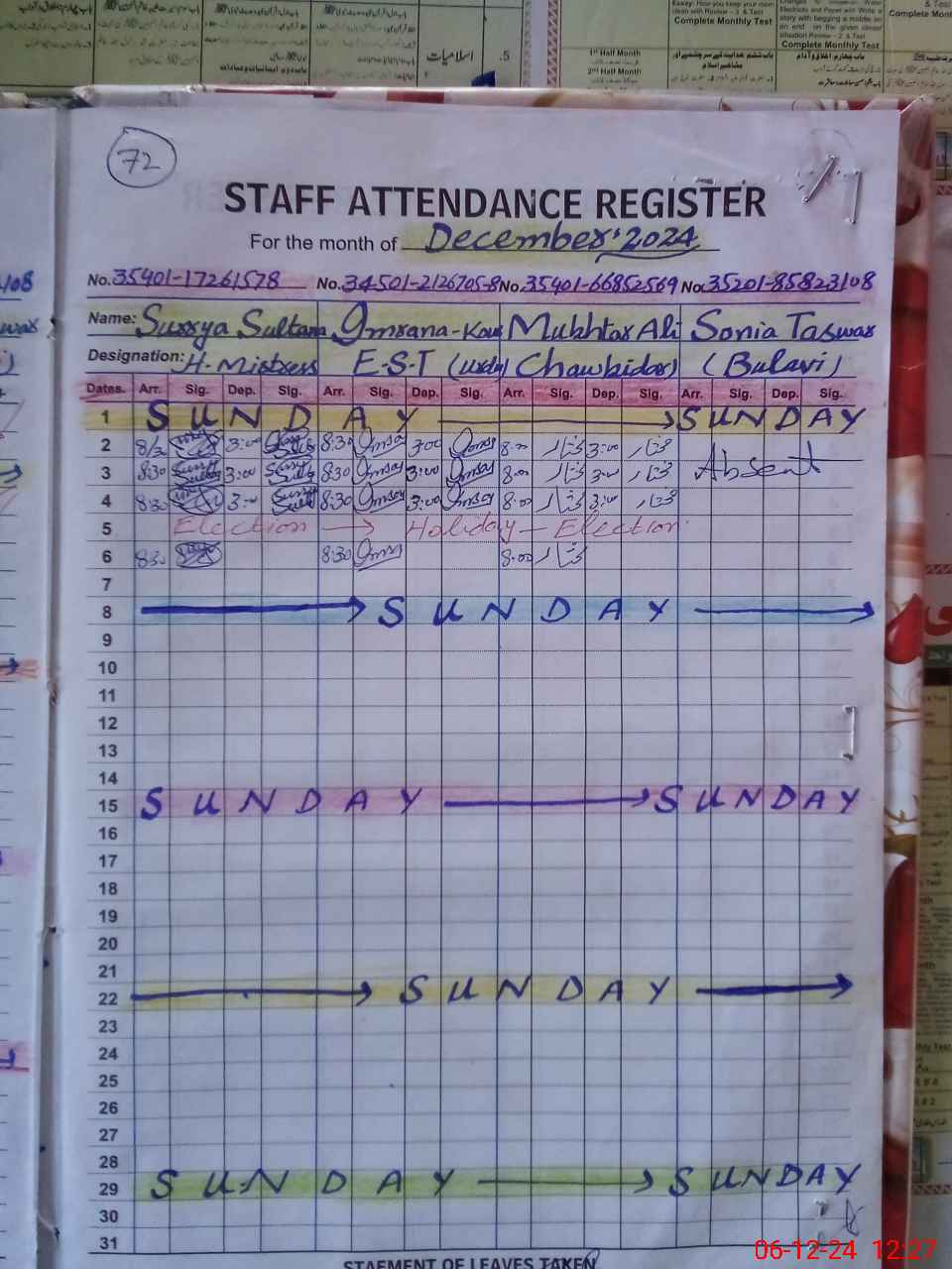 | CNIC | Full Name | Designation | R/C | Absence During Last Calender Month |