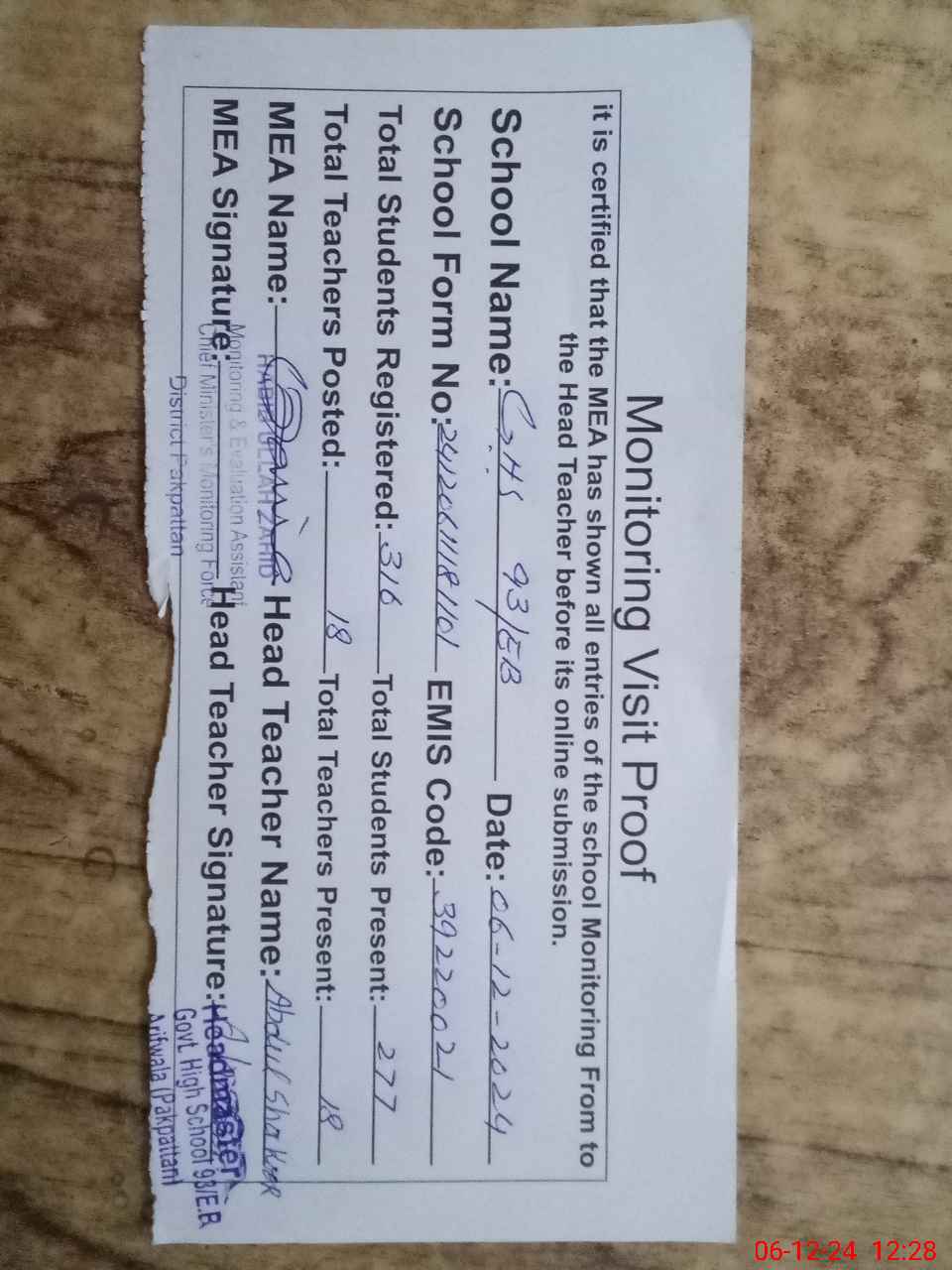 | Attendance Register | Head Teacher | MEA with School | Visit Proof |