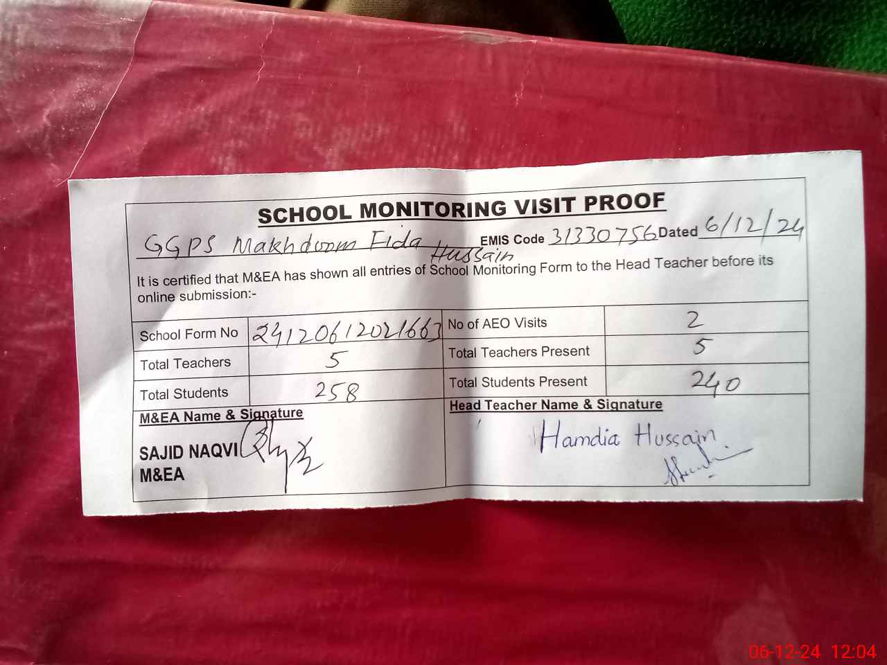 | Attendance Register | Head Teacher | MEA with School | Visit Proof |