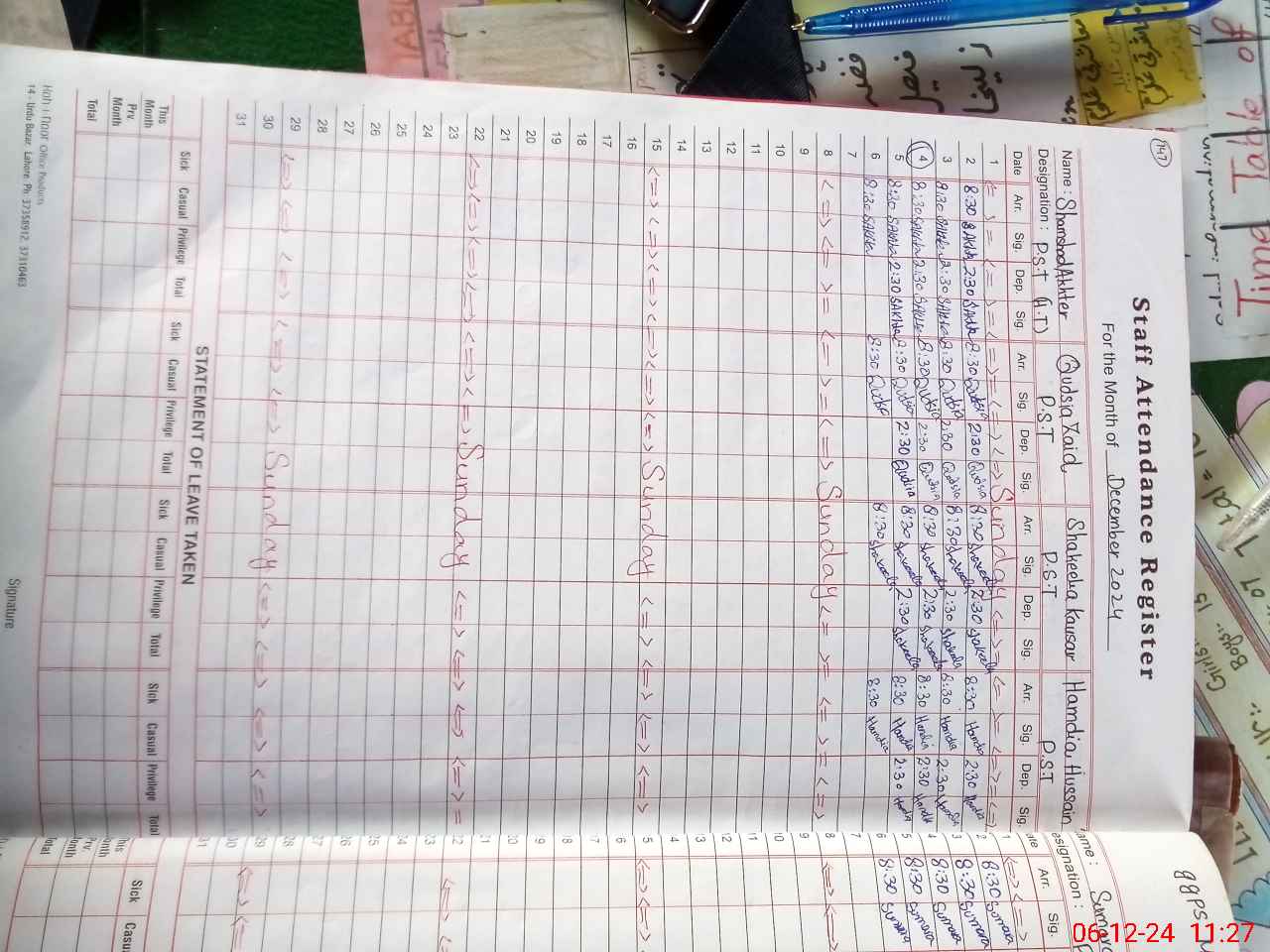 | CNIC | Full Name | Designation | R/C | Absence During Last Calender Month |