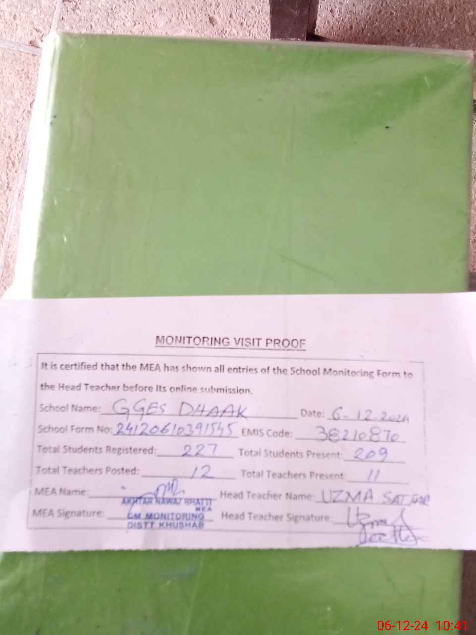 | Attendance Register | Head Teacher | MEA with School | Visit Proof |