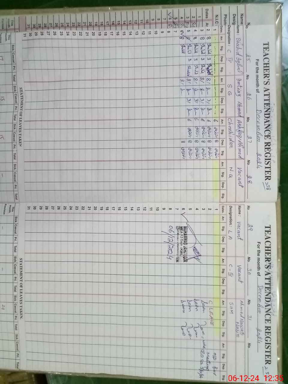 | Remarks (Use Separate Page if Required): NSB GRANTS RECORDS ARE NOT MAINTAINED BANK STATEMENTS UPTO 24 OCTOBER 2024 AVAILABLE FTF RECORDS ARE ALSO NOT MAINTAINED BANK STATEMENTS UPTO 06 JULY 2024 AVAILABLE TWO TOILETS FOUND BLOCKED AND NON FUNCTIONAL WASH CLUB RECORDS ARE NOT AVAILABLE RANDOM CLASS TWO IS NOW IN CLASS FIVE | |||||