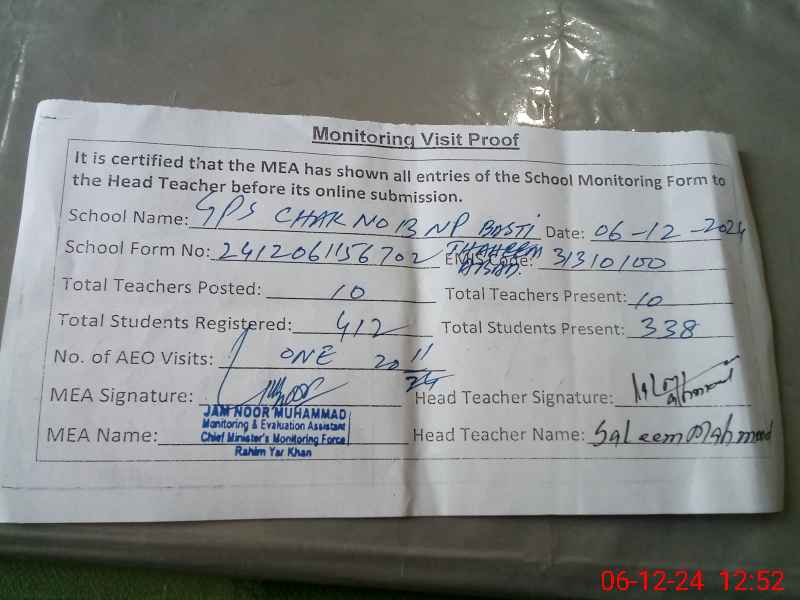 | EMIS Code: 31310100 | Name of School: GPS CHAK 13/NP BASTI THAHEEMA KHANPUR | |||