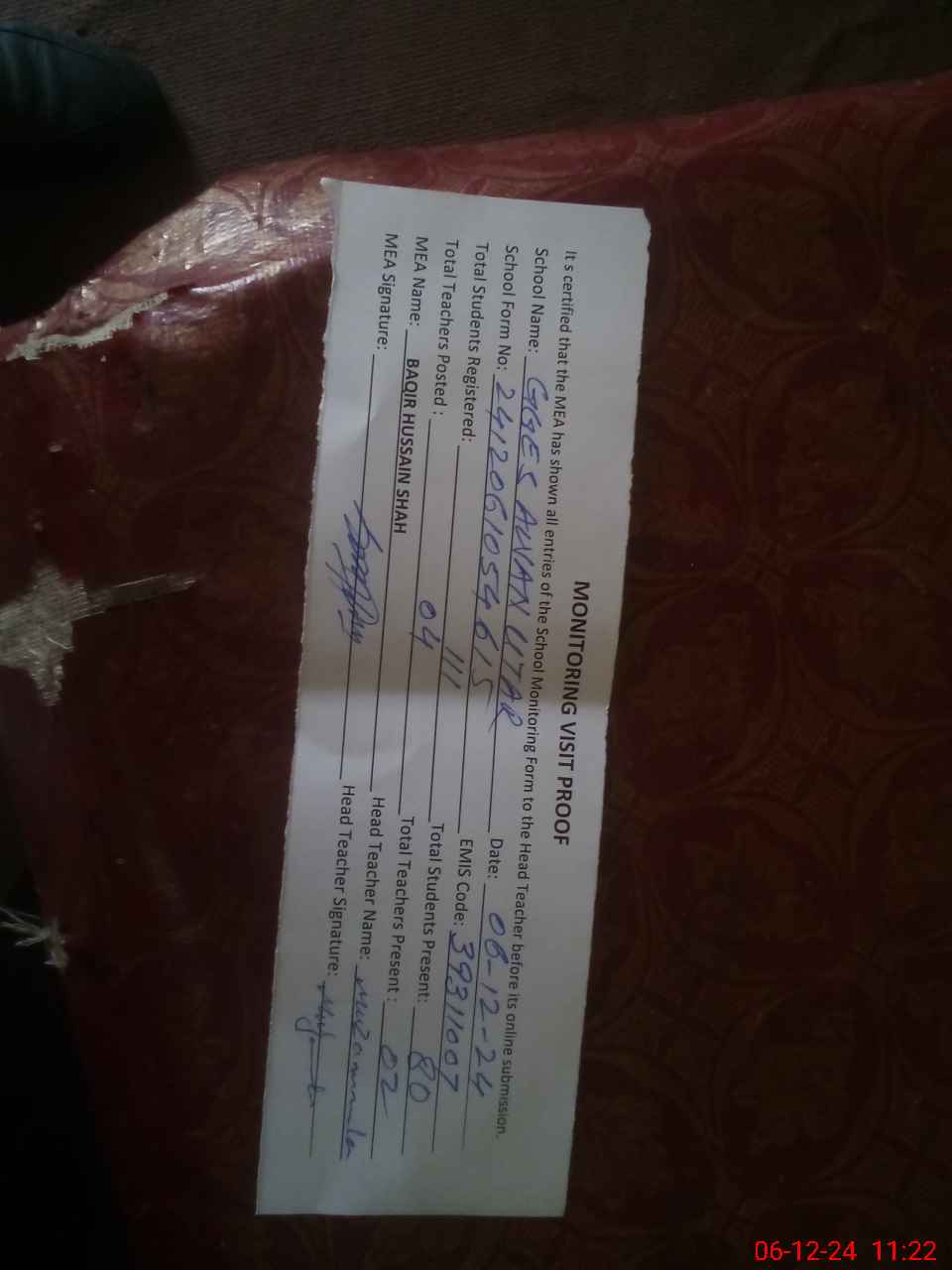 | Attendance Register | Head Teacher | MEA with School | Visit Proof |
