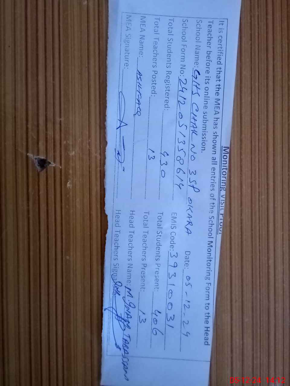 | Attendance Register | Head Teacher | MEA with School | Visit Proof |