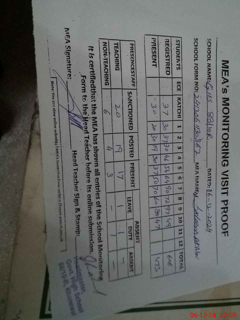 | Attendance Register | Head Teacher | MEA with School | Visit Proof |