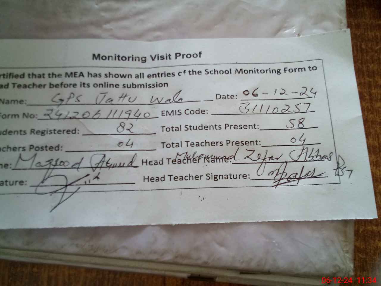 | Attendance Register | Head Teacher | MEA with School | Visit Proof |
