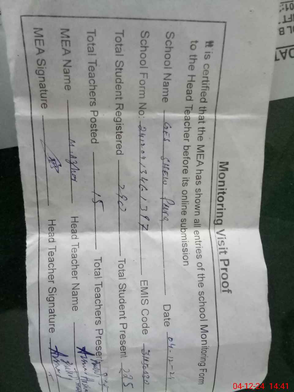 | Attendance Register | Head Teacher | MEA with School | Visit Proof |