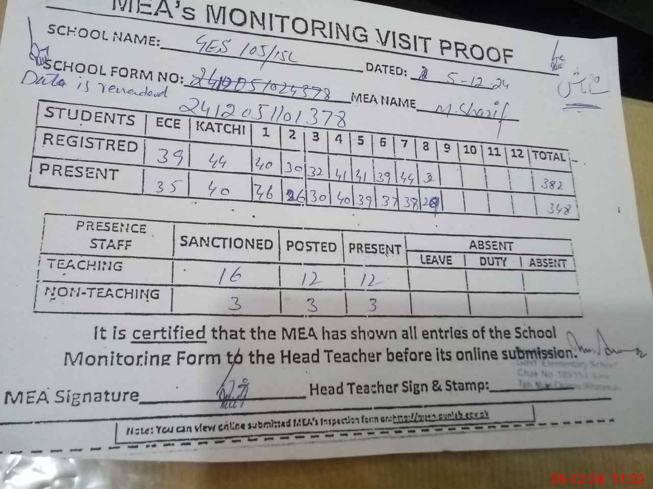 | Attendance Register | Head Teacher | MEA with School | Visit Proof |