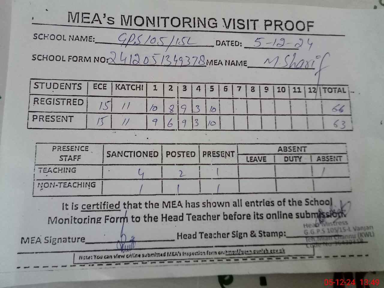 | Attendance Register | Head Teacher | MEA with School | Visit Proof |
