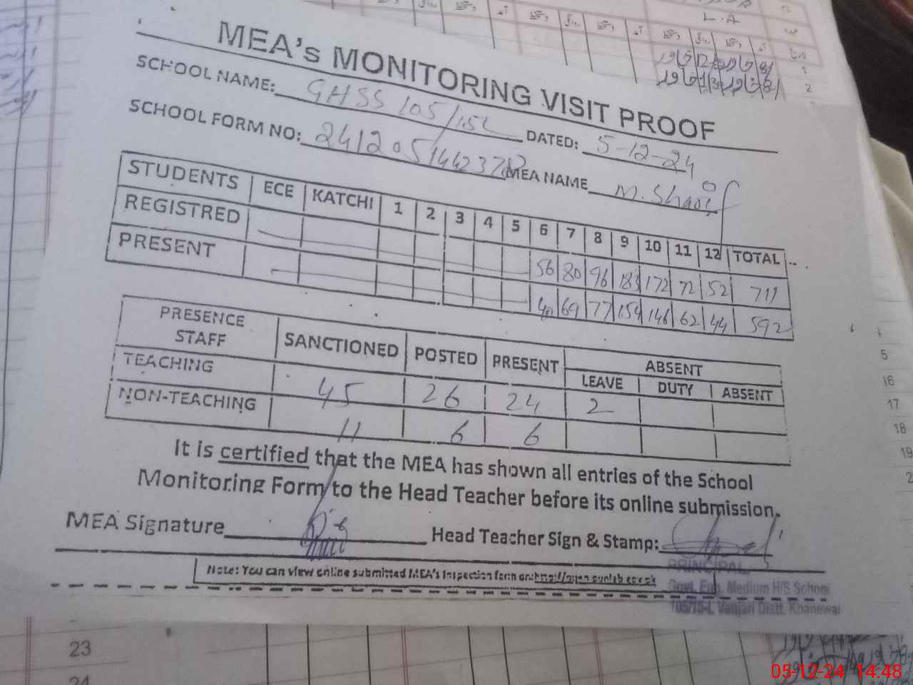 | EMIS Code: 36430001 | Name of School: GHSS 105/15-L VANJARI MIAN CHANNU | |||