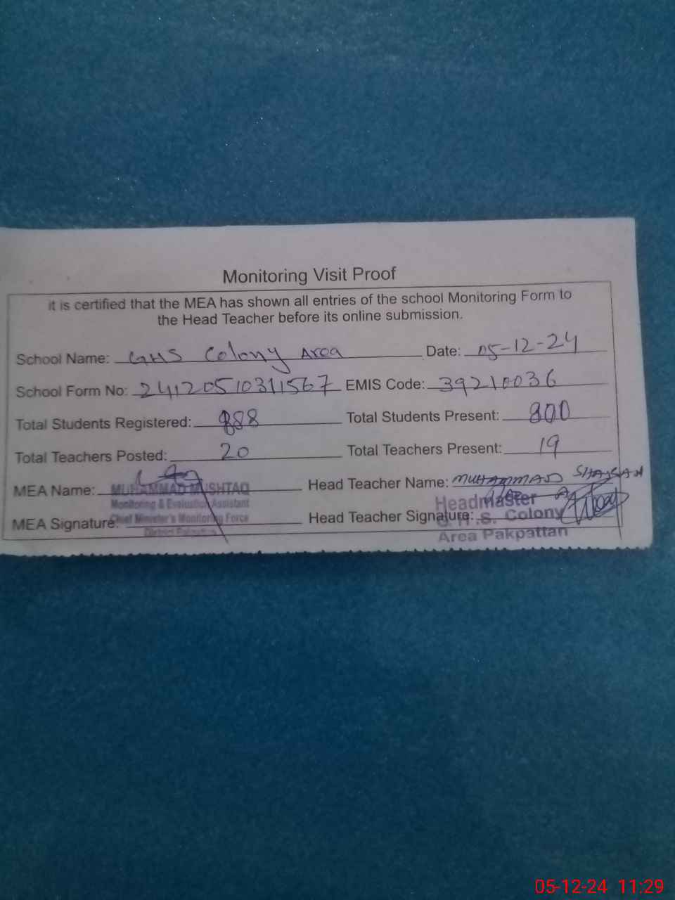 | EMIS Code: 39210036 | Name of School: GHS COLONY AREA PAKPATTAN | |||