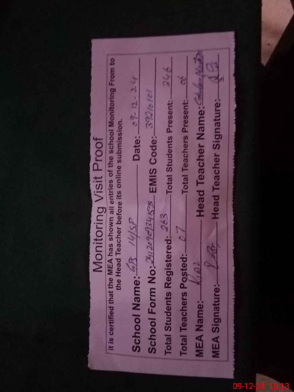 | Attendance Register | Head Teacher | MEA with School | Visit Proof |