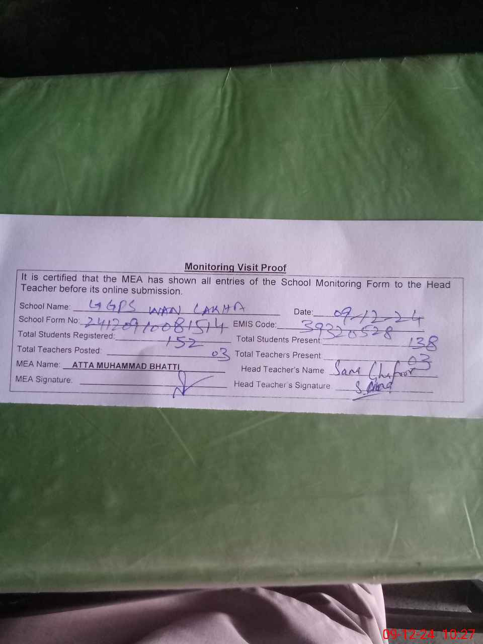 | EMIS Code: 39320528 | Name of School: GGPS WAN LAKHA | |||