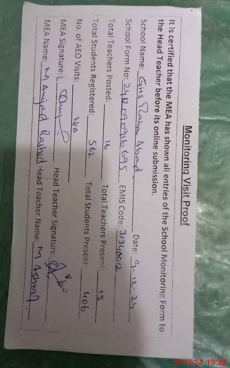 | Attendance Register | Head Teacher | MEA with School | Visit Proof |