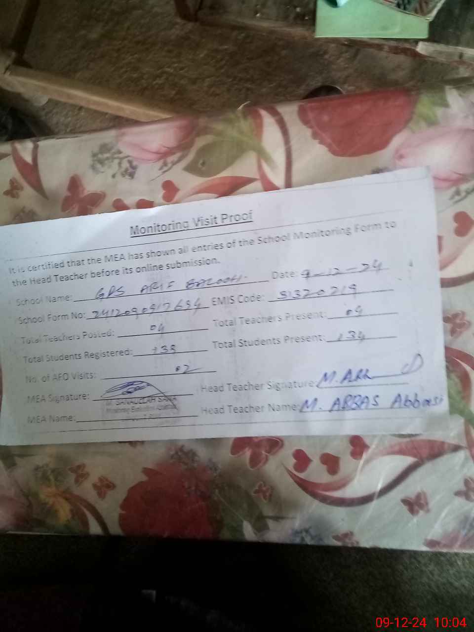 | EMIS Code: 31320219 | Name of School: GPS AARIF BLOCH | |||
