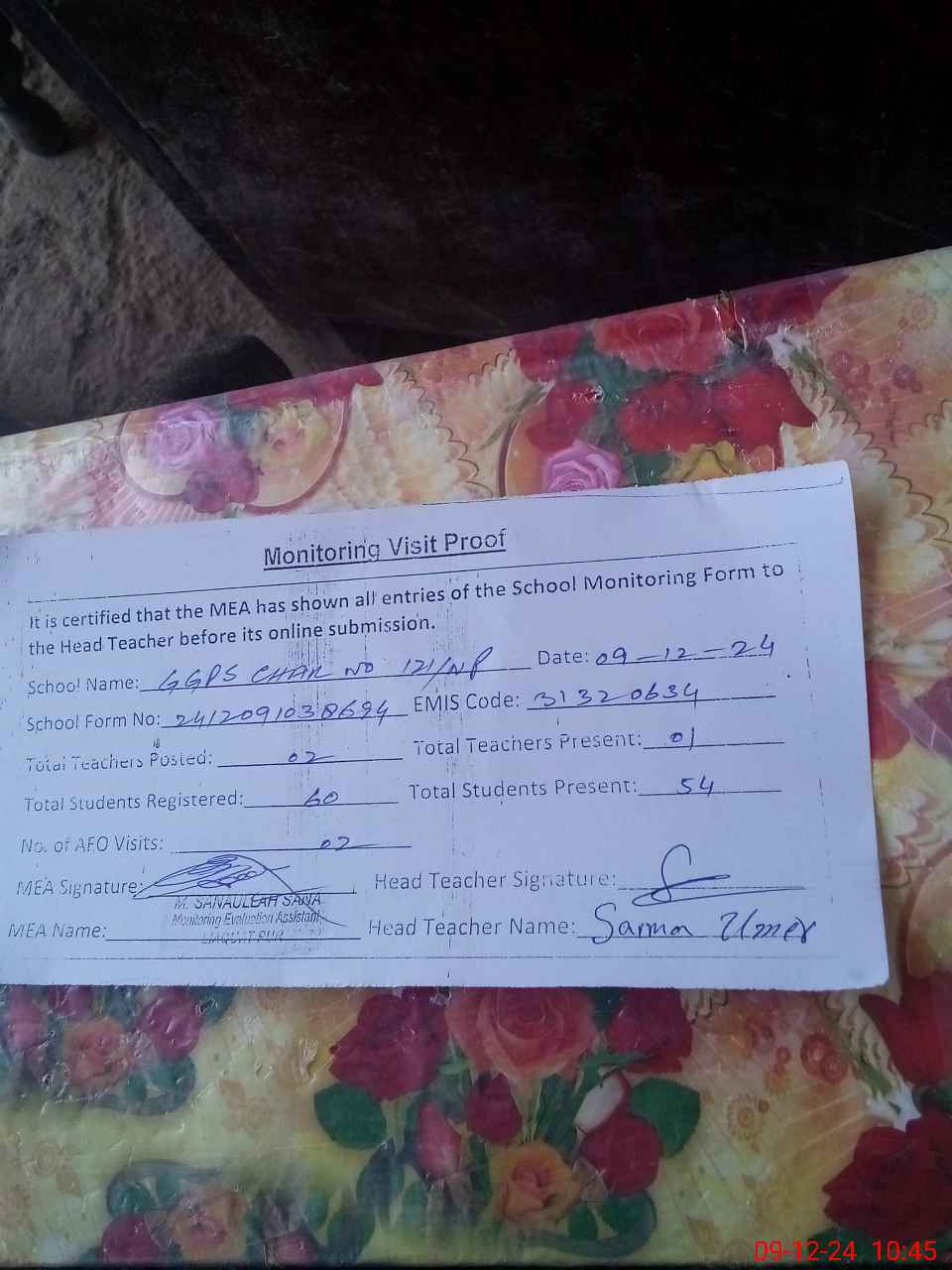 | Attendance Register | Head Teacher | MEA with School | Visit Proof |