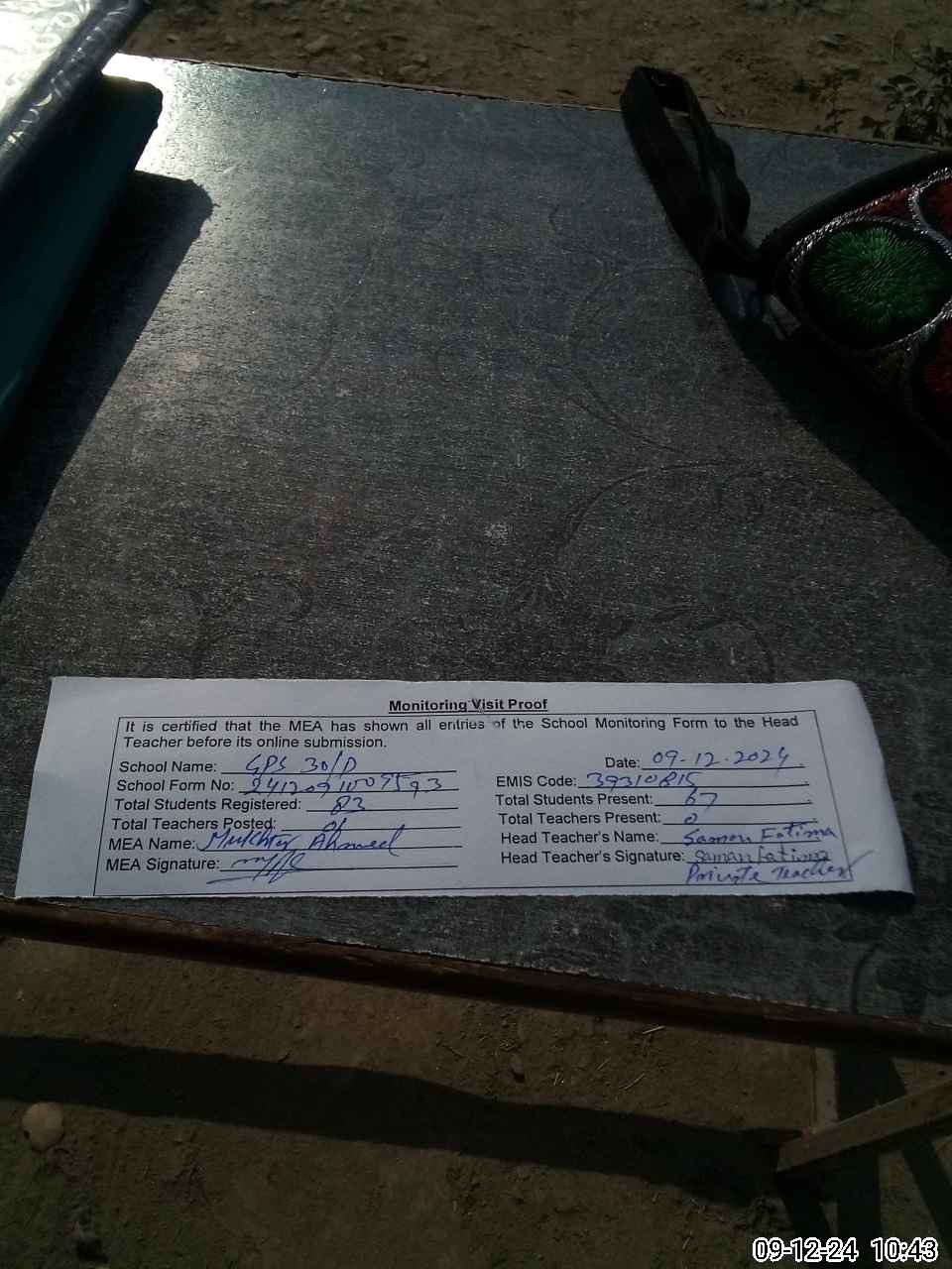 | Attendance Register | Head Teacher | MEA with School | Visit Proof |