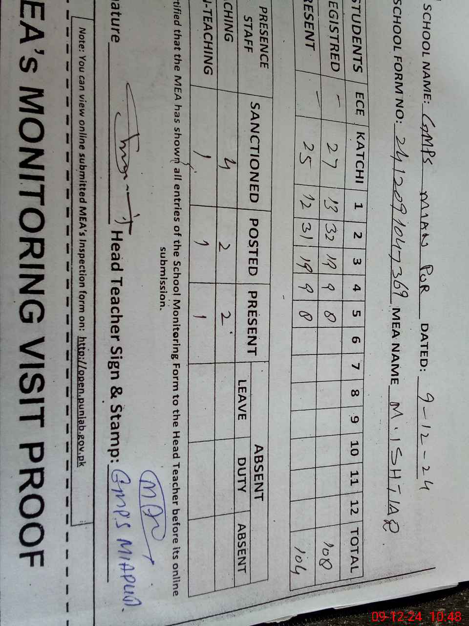 | Attendance Register | Head Teacher | MEA with School | Visit Proof |