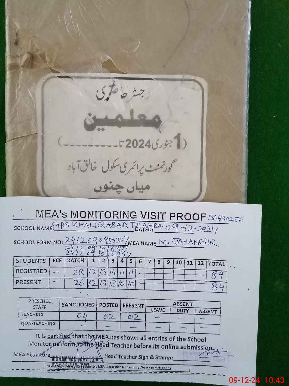 | Attendance Register | Head Teacher | MEA with School | Visit Proof |