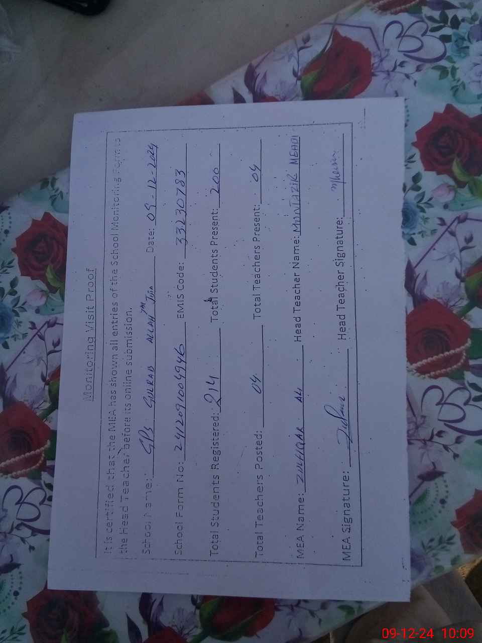 | Attendance Register | Head Teacher | MEA with School | Visit Proof |