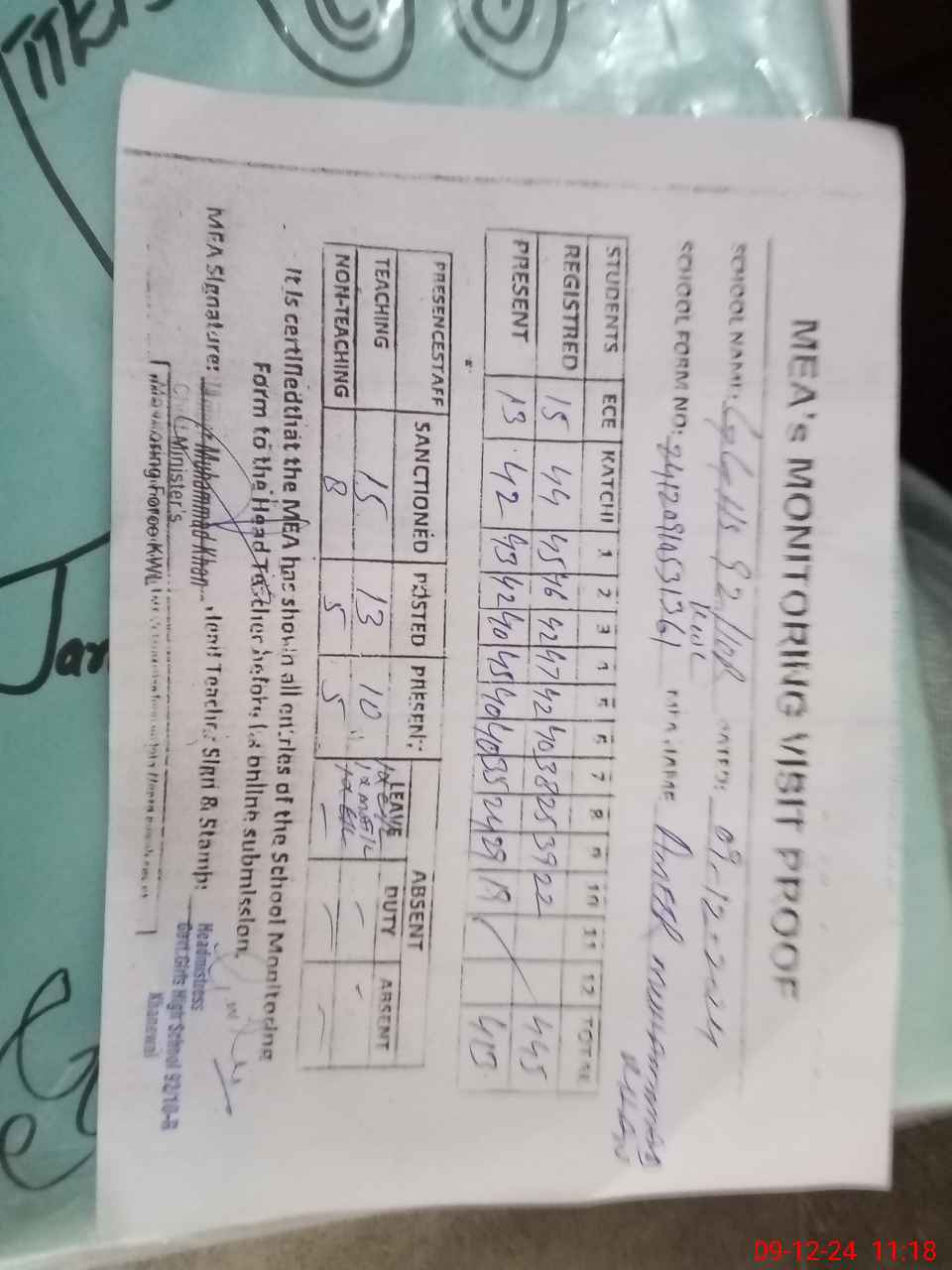 | Attendance Register | Head Teacher | MEA with School | Visit Proof |