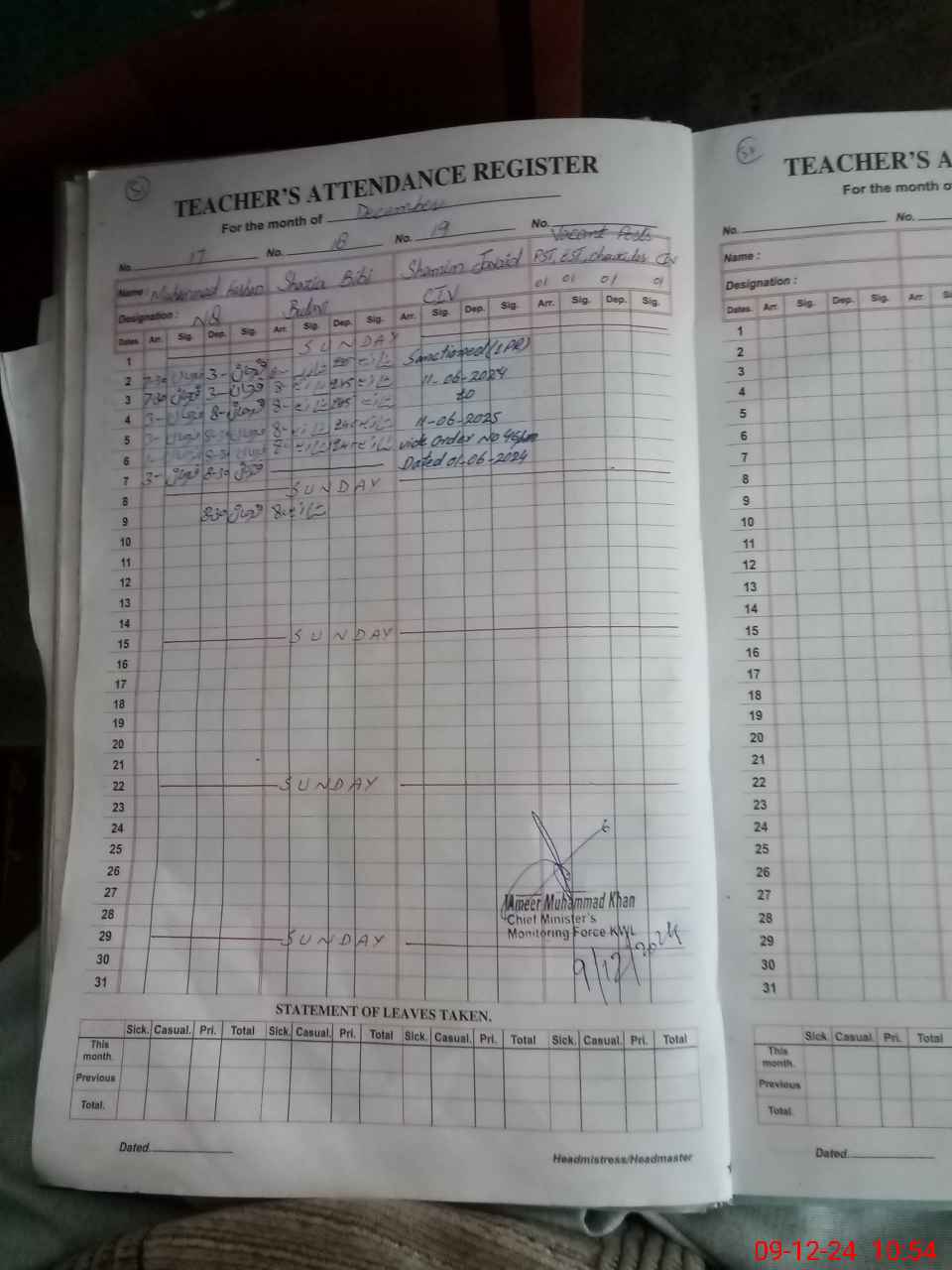 | CNIC | Full Name | Designation | R/C | Absence During Last Calender Month |