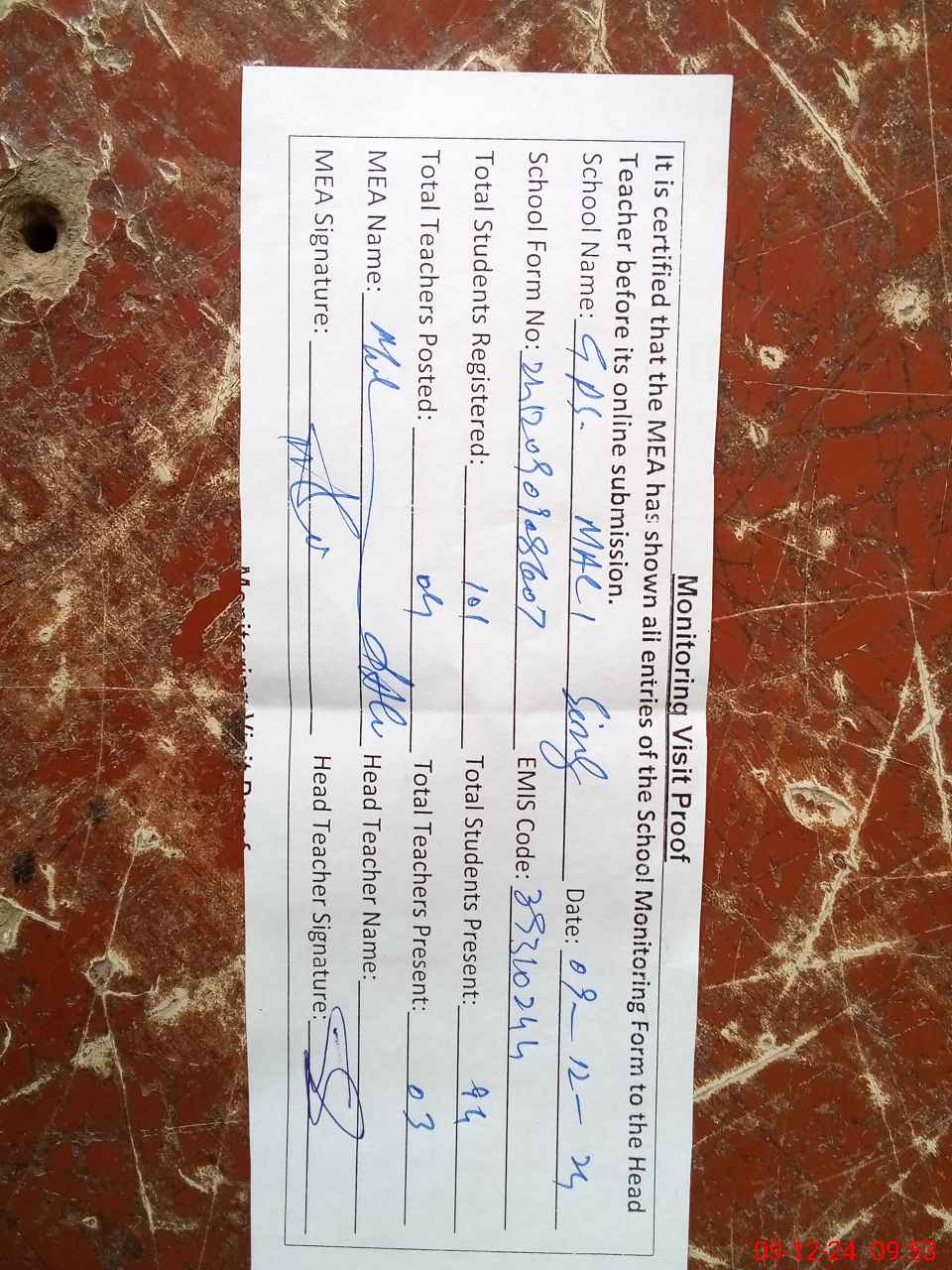 | Attendance Register | Head Teacher | MEA with School | Visit Proof |