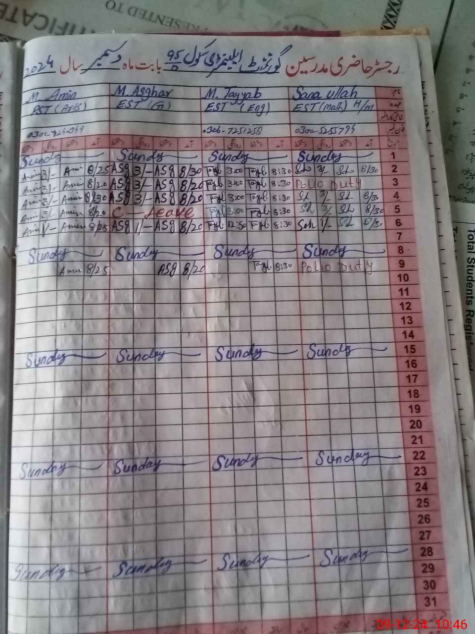 | CNIC | Full Name | Designation | R/C | Absence During Last Calender Month |