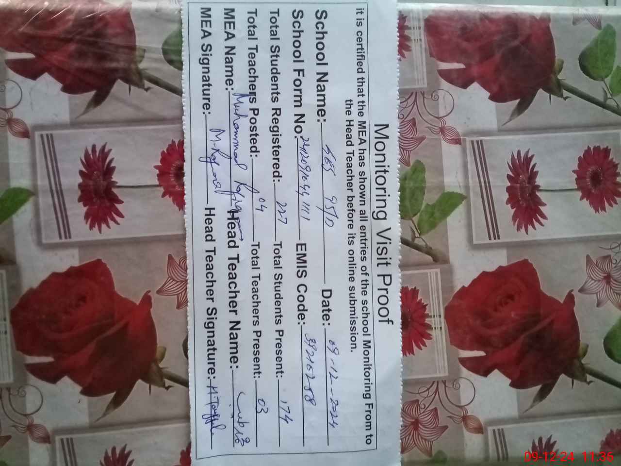 | Attendance Register | Head Teacher | MEA with School | Visit Proof |