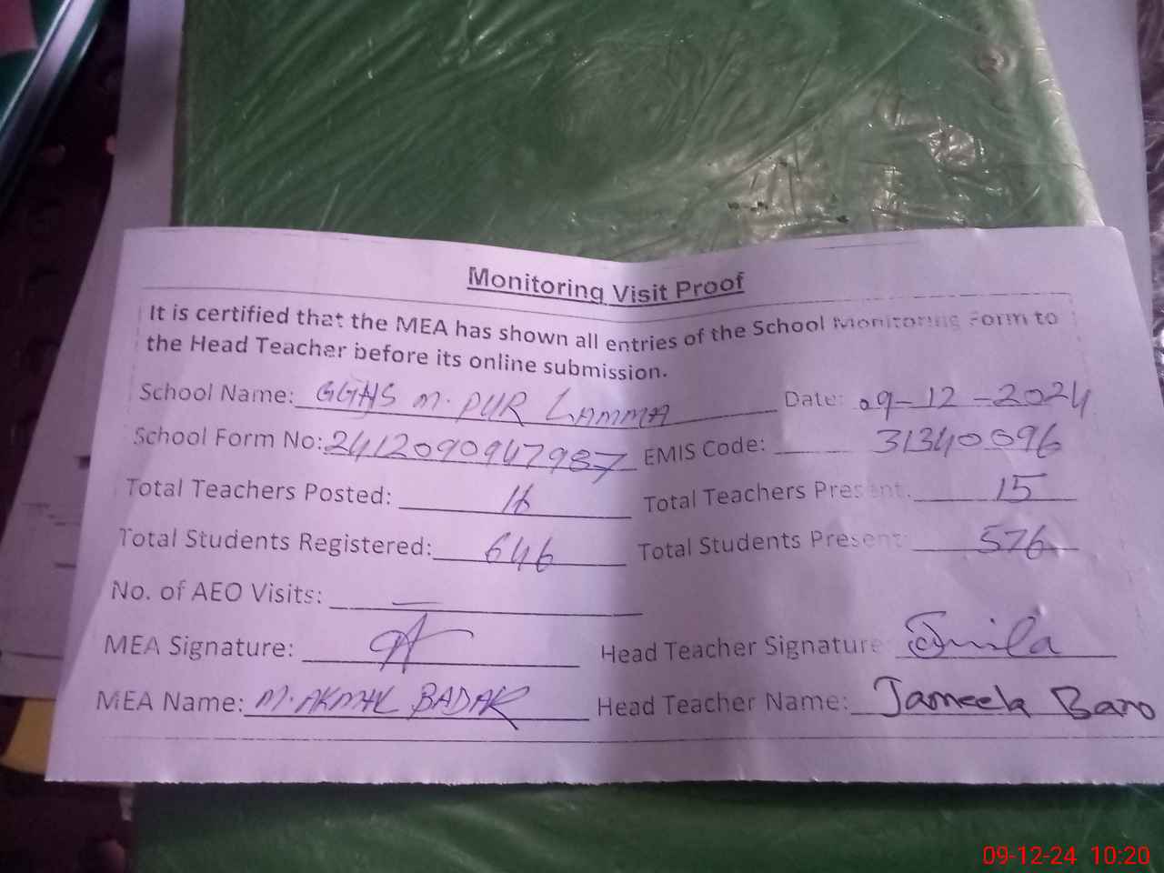 | EMIS Code: 31340096 | Name of School: GGHS MUHAMMAD PUR LAMMA | |||