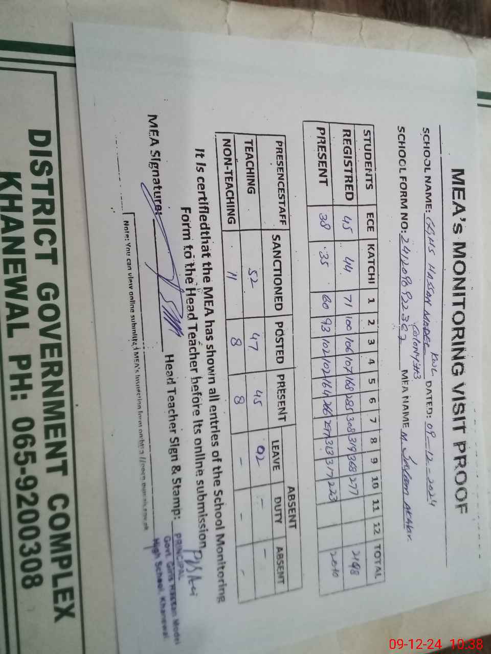 | Certified that this School was Inspected by the Undersigned MEA/DMO Today and the Information Stated Above is as Per Record. | |||||