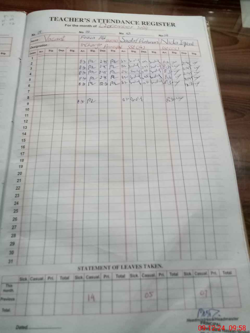 | CNIC | Full Name | Designation | R/C | Absence During Last Calender Month |