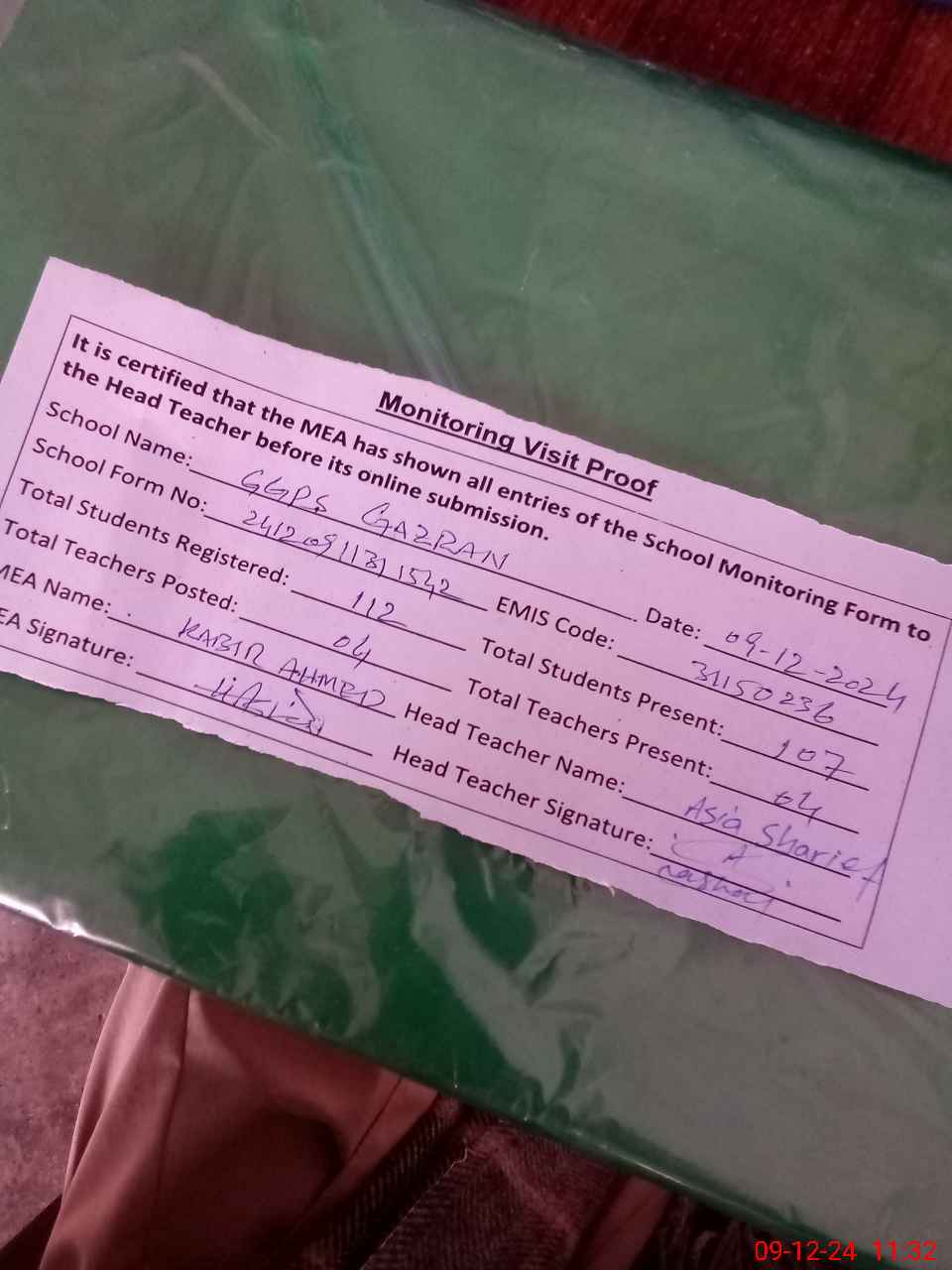 | Attendance Register | Head Teacher | MEA with School | Visit Proof |