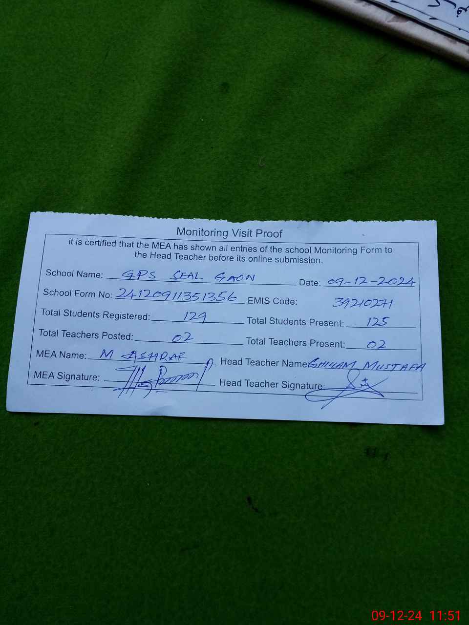 | Attendance Register | Head Teacher | MEA with School | Visit Proof |