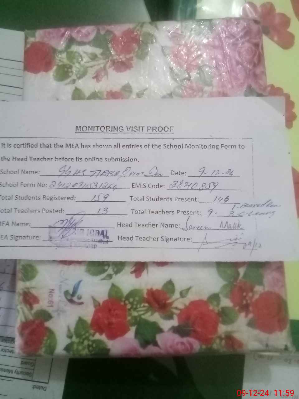 | Attendance Register | Head Teacher | MEA with School | Visit Proof |