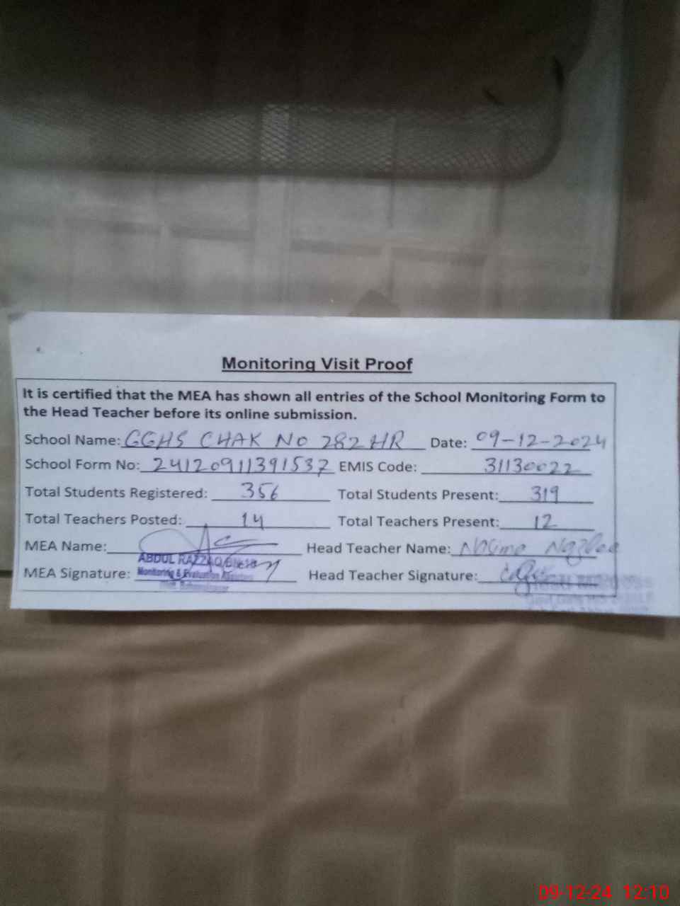 | Attendance Register | Head Teacher | MEA with School | Visit Proof |