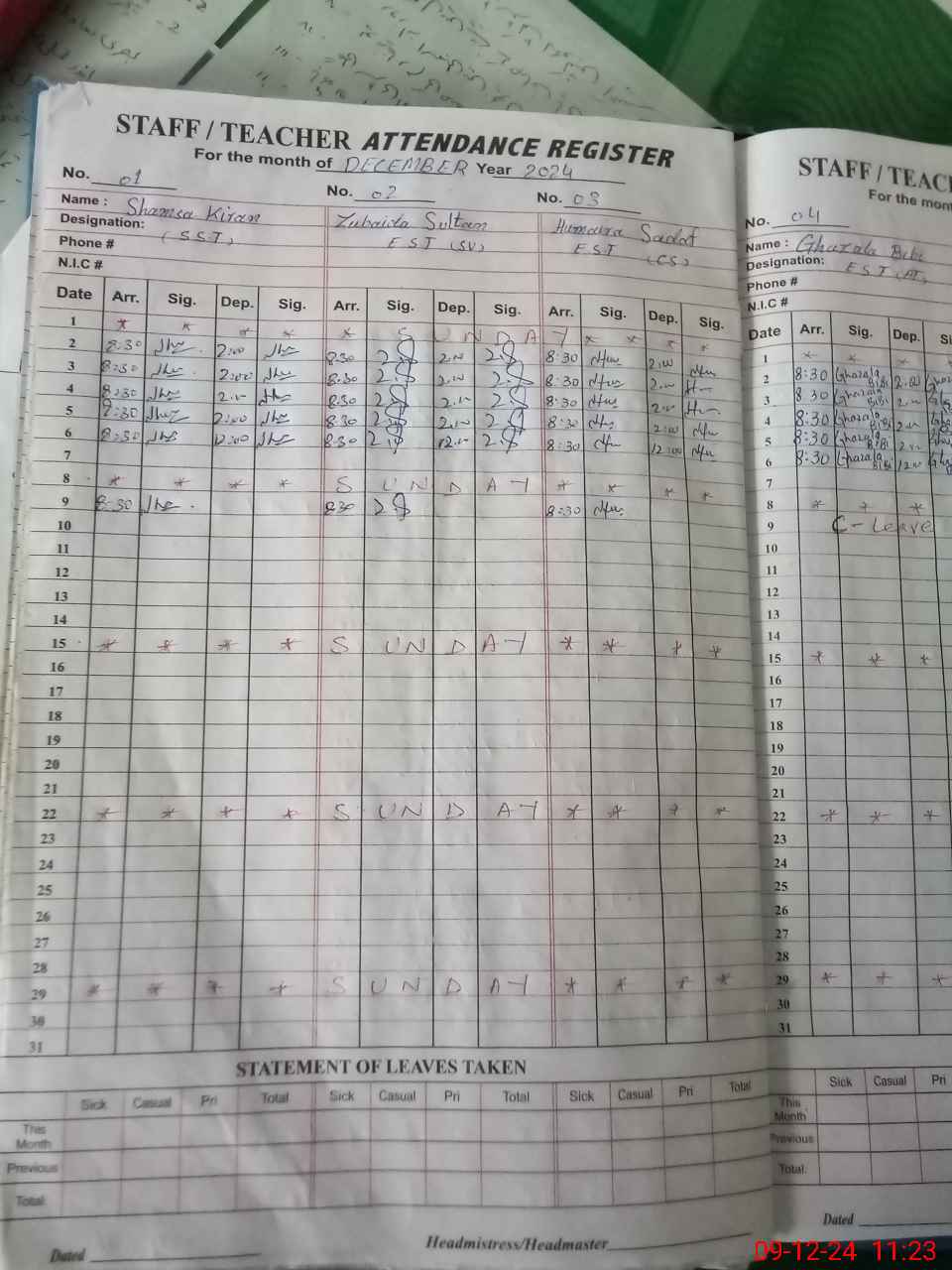 | CNIC | Full Name | Designation | R/C | Absence During Last Calender Month |