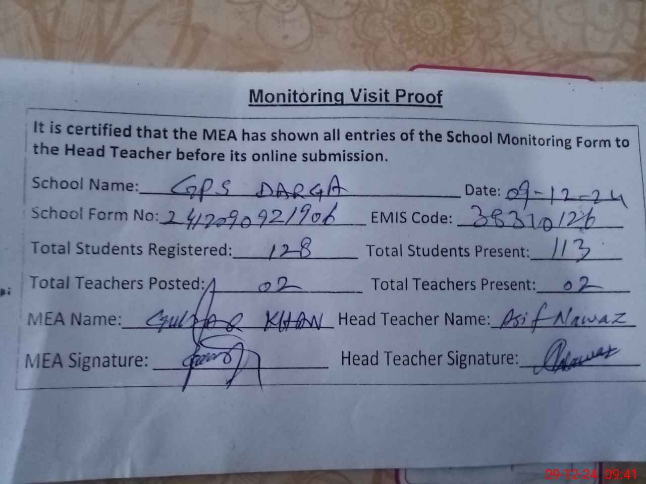 | Attendance Register | Head Teacher | MEA with School | Visit Proof |