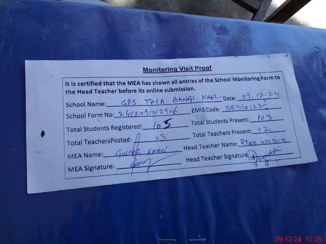 | Attendance Register | Head Teacher | MEA with School | Visit Proof |