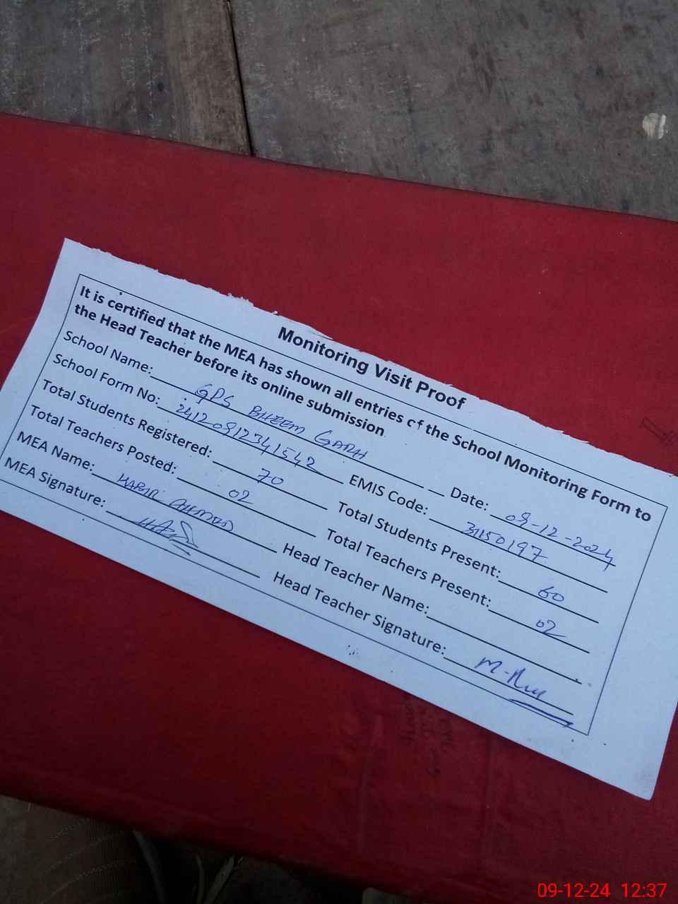 | Attendance Register | Head Teacher | MEA with School | Visit Proof |